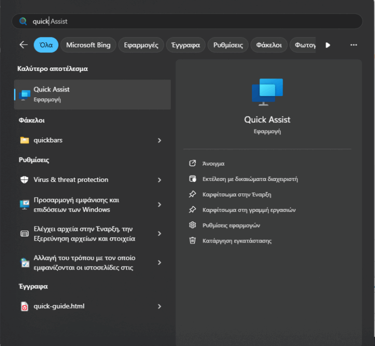 Η εύρεση του προγράμματος είναι εύκολη, γράφοντας στην εύρεση quick assist ή Γρήγορη Βοήθεια.